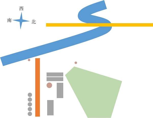 一般来说,8月底的重庆仍是酷暑难当,从中午11点到下午17点基本无法开工,所以开工仪式最有可能的时段是上午。重庆位于北半球,上午太阳的方向偏东,影子当偏西。当天的天气晴朗,从①②处建筑影子方向可知,中间公路应当是东西方向,远处是西。所以新校区位于河道东侧。河道上的桥梁大体是连接东西方向,但具体角度无法判断。