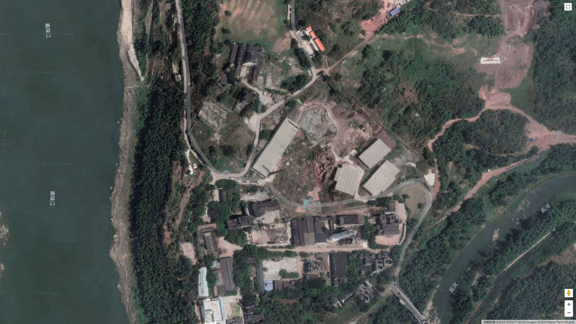 放大①处的卫星地图,可以从中找到与前述标志性建筑符合的地形,其位于北纬29.755、东经106.526的清溪口附近,卫星地图中的建筑阴影方位与前面航拍图基本一致,西侧的“S”弯河道是嘉陵江,远处的桥梁是有两座桥墩的水土新城大桥,更远处的桥梁分别是水土嘉陵江大桥(两座超出桥面的桥墩)和观音峡嘉陵江特大桥(在建,多桥墩)。